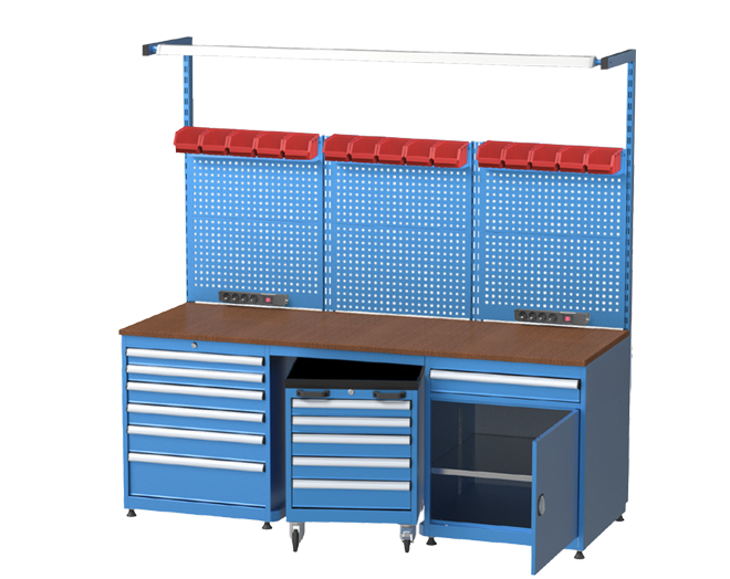 <p>Uzun tip 12 çekmeceli, 1 dolaplı, aydınlatmalı ve askı panolu çalışma tezgahı </p>