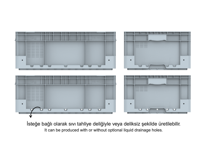 <li>İsteğe bağlı dört yönünde yan alt yüzeylerinde sıvı tahliye delikleri açık üretilebilir.</li>