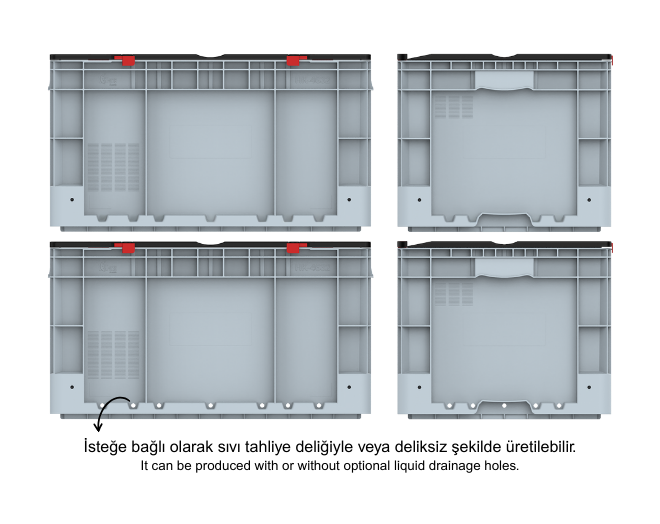 <li>İsteğe bağlı dört yönünde yan alt yüzeylerinde sıvı tahliye delikleri açık üretilebilir.</li>
